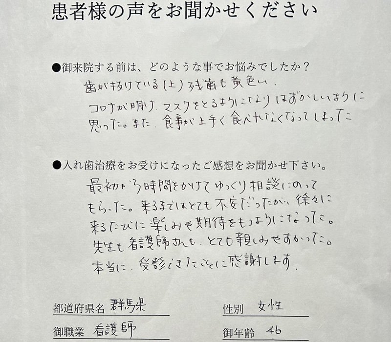 群馬県 看護師 女性 2024 3/05 2024年3月5日 目次御来院前は、どのような事でお悩みでしたか? 歯が抜けている(上)残歯も黄色い。 コロナが明け、マスクをとるようになりはずかしいように思った。 また、食事が上手く食べれなくなってしまった 入れ歯治療をお受けになったご感想をお聞かせ下さい。 最初から時間をかけてゆっくり相談にのってもらった。 来るまではとても不安だったが、徐々に来るたびに楽しみや期待をもつようになった。 先生も看護師さんもとても親しみやすかった。 本当に、受診できたことに感謝します。 群馬県前橋市の入れ歯/義歯 専門歯科 Adii Dental Clinic